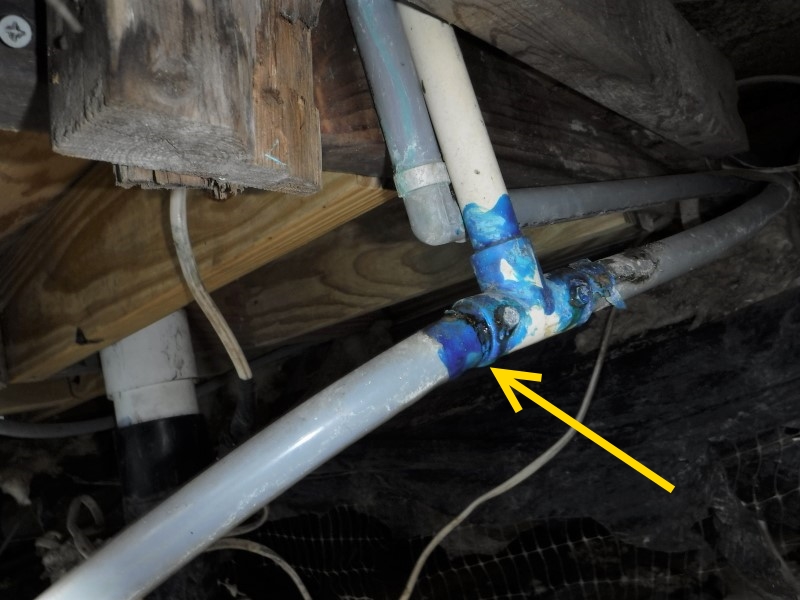 This is definitely a "bless his heart" moment. This plumbing connection was leaking. Can you guess why. Improper connection method. PVC is supposed to be solvent glued, however polybutylene is connected using crimped fittings. Looks like they tried to glue the poly and it was leaking.