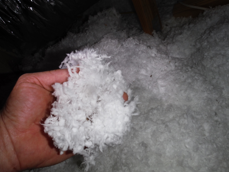 At left is blown in fiberglass insulation which is very popular with many builders today. A very good insulator it is nearly fireproof, rot proof and won't absorb moisture. The R value of fiberglass can vary somewhat depending on how it is fluffed up. On older homes the fiberglass is denser and stays in place better than what you see here. This kind is easily airborne and trampled by workmen etc. thus reducing its R value in those places. Because it is so light there will often be bare spots in the attic next to cornice vents etc. where the wind has blown it back.
