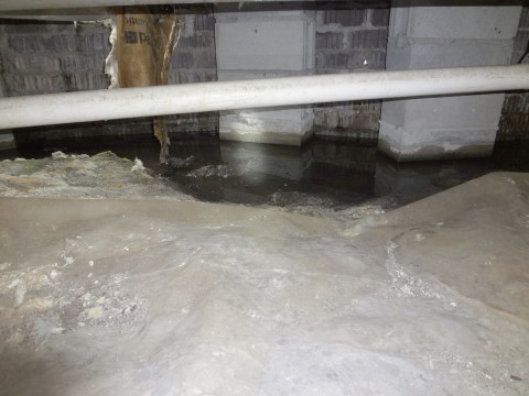 That's right .... it's actually a mini lake under this home. I should have brought my fishing pole. Dirt was never knocked down after initial construction so low spots near the foundation are holding water causing all kinds of damage. It appears that dry cement was spread out onto the ground in a haphazard attempt to dry the soil out. In some cases sump pumps can be used to keep a crawlspace dry.